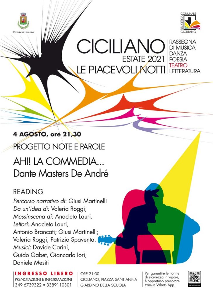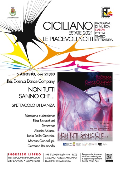 Ciciliano –  E’ giunto all’ultima settimana il ricco programma della rassegna “Le Piacevoli Notti” di Ciciliano. Un’annata che sta superando ogni aspettativa, in termini di entusiasmo e partecipazione. La voglia di stare insieme e divertirsi ha superato ogni ostacolo, e l’ottima organizzazione da parte della Biblioteca comunale di Ciciliano ha fatto sì che tutto ciò fosse possibile, in un clima di massima serenità e sicurezza. Eventi spettacolari, piacevoli e interessanti si sono alternati in queste serate estive, all’insegna della dell’accoglienza, della cultura e della bellezza, in tutte le sue forme artistiche.