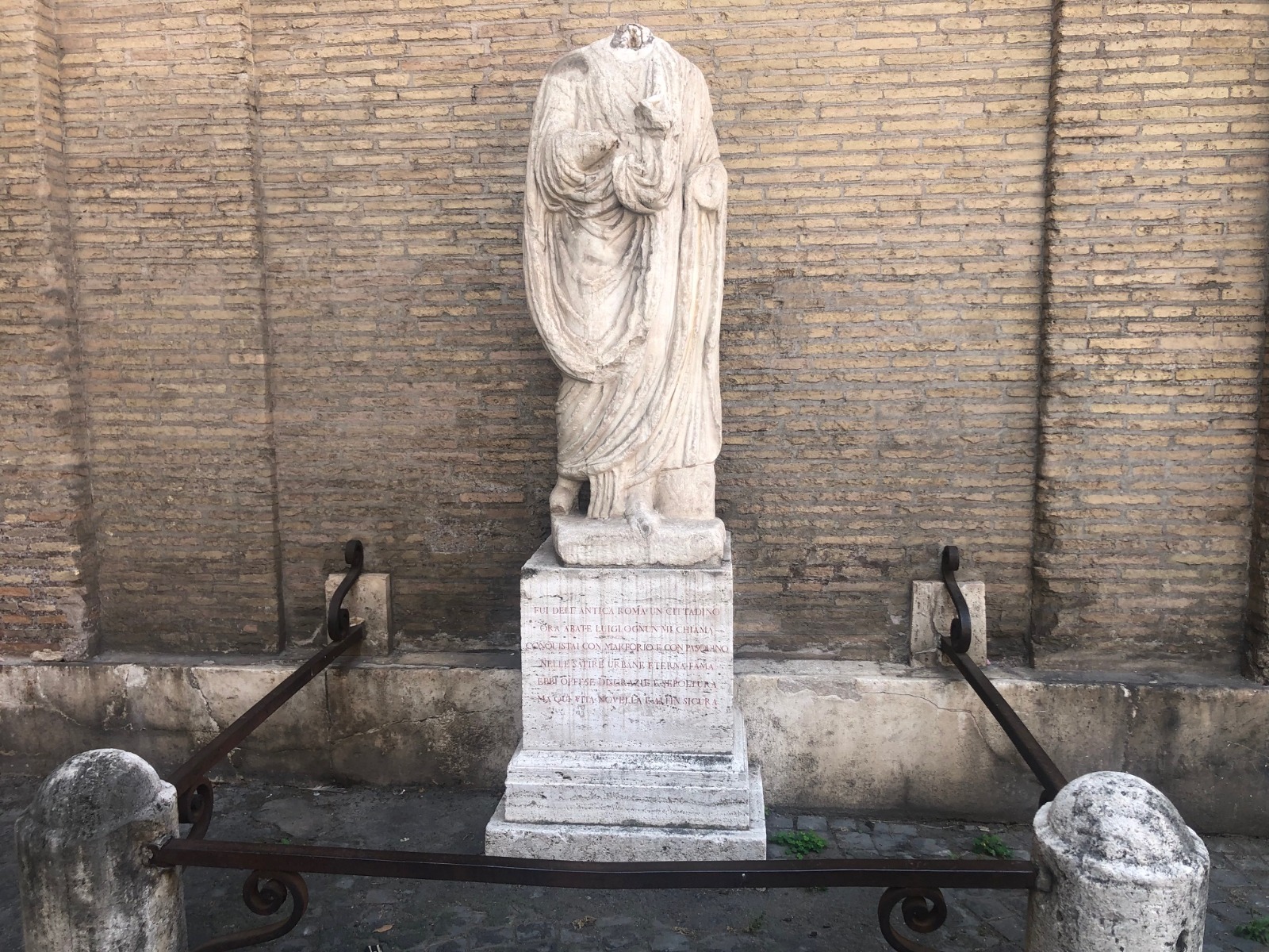 Al lato della Chiesa di Sant’Andrea della Valle, troviamo invece l’Abate Luigi, così chiamato perché pare somigliasse al sagrestano della vicina chiesa del Sudario. La statua, di epoca tardo imperiale, raffigurante un uomo togato, forse un magistrato o un senatore romano, fu ritrovata alla fine del Cinquecento nelle fondamenta di palazzo Vidoni. È priva della testa a causa di atti di vandalismo, come si deduce dalla scritta alla base: “Fui dell’antica Roma un cittadino, ora Abate Luigi ognun mi chiama. Conquistai con Marforio e con Pasquino nelle satire urbane eterna fama, ebbi offese, disgrazie e sepoltura, ma qui vita novella e alfin sicura”.