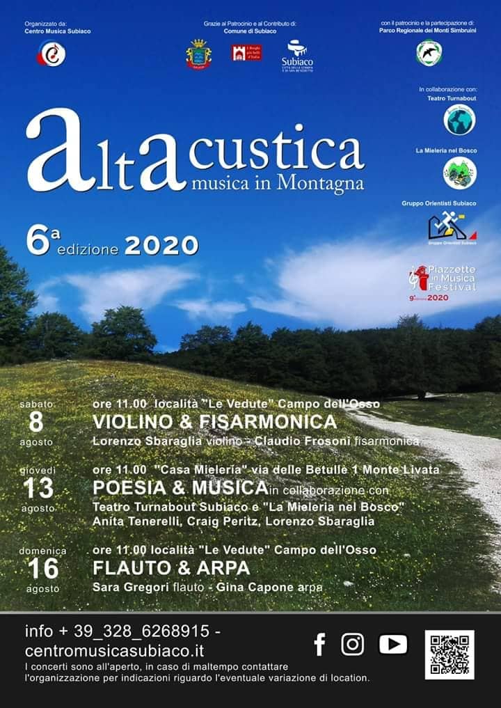 Monte Livata – Dalla natura alla musica: l’estate a Monte Livata accende la magia con un ricco programma di eventi musicali, per condividere insieme la bellezza dello stare insieme in compagnia della buona musica con strumentisti di alto livello. In collaborazione con il TeatroTurnabout, La Mieleria Nel Bosco e Gruppo Orientisti Subiaco parte la sesta edizione di “AltAcustica 2020”: tre serate di concerti che si svolgeranno nei giorni 8, 13 e 16 agosto.