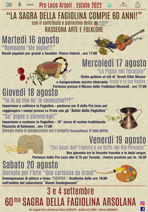 ARSOLI – Una serie di appuntamenti in grande stile caratterizzeranno l’estate agostana 2022 ad Arsoli. Eventi organizzati dalla Pro Loco di Arsoli e che precedono un evento storico: la sessantesima edizione della Sagra della Fagiolina. Un cult che caratterizza con questo prodotto prestigioso la comunità arsolana. La due giorni è prevista per il prossimo 3 e 4 settembre 2022. Questo il dettaglio eventi: