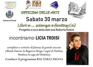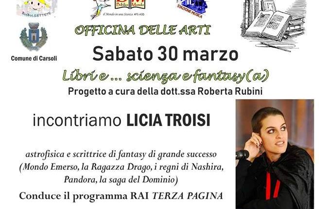 Carsoli – Nell’ambito del progetto Officina delle Arti sabato 30 marzo sarà ospitata a Carsoli Licia Troisi, la più nota scrittrice di fantasy italiana, astrofisica, attuamente conduttrice della trasmissione RAI Terza Pagina. Grande successo sia in Italia che all’estero hanno ottenuto le saghe del Mondo Emerso, della Ragazza Drago, dei Regni di Nashira, la saga del Dominio, ecc.