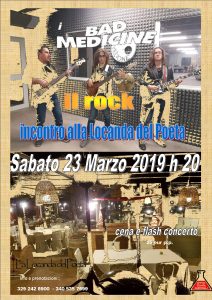 News Bad Medicine – L’appuntamento è per Sabato 23 Marzo 2019 alle ore 20.00 per una conviviale nella suggestiva cornice del Ristorante “La Locanda del Poeta”. Una occasione per presentare ufficialmente le attività dei Bad Medicine, prospettive verso Sanremo, e per trascorrere insieme una serata conviviale con le squisitezze della Locanda e con un nostro flash concerto. La quota di partecipazione per la cena  è di Euro 25,00 p.p. Saremo uniti nella musica del rock ed in questo progetto che ci vede protagonisti, dunque vi aspettiamo”