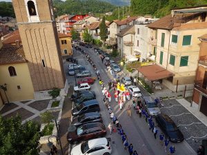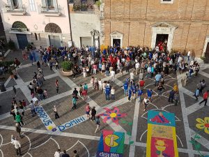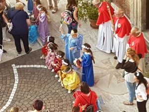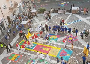 Carsoli – Si è svolta in un clima di grande partecipazione popolare di fede e di raccoglimento la solenne celebrazione del “Corpus Domini”, quest’anno arricchita dall’Infiorata organizzata dalla Pro-Loco Carseoli. La Piazza Corradino e via Valeria sono state addobbate a festa con realizzazione manuale di mosaici fiorati multicolore che hanno riprodotto fiori, immagini sacre e contenenti dediche e raffigurazioni del Corpus Domini. Vere e proprie opere d’arte, realizzate dagli stessi componenti della Pro-Loco Carseoli. Ciò ha reso ancorpiù intensa e suggestiva la Processione alla quale hanno presenziato numerose rappresentanze di organizzazioni, ed associazioni locali. I componenti della Pro-Loco Carseoli guidati dalla attivissima presidente Francesca Cantiello hanno indossato le maglie di colore blu, unitamente al gruppo devoti della Santissima Trinità di Carsoli che ha partecipato in maglia e stendardo. Sono tornati anche gli “angioletti”, stupendi bambini vestiti a festa per onorare il Corpus Domini con tanto di ali al seguito. Quest’anno è come se questa ricorrenza sia stato un richiamo raccolto da tante categorie, persone, fedeli e dalla comunità che si è ritrovata in uno dei momenti più forti ed intensi della fede Cristiana. Il parroco don Roberto Cristofaro durante l’omelia ha riaffermato e spiegato i concetti religiosi e profondi legati al Corpus Domini.