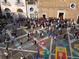 Carsoli – Si è svolta in un clima di grande partecipazione popolare di fede e di raccoglimento la solenne celebrazione del “Corpus Domini”, quest’anno arricchita dall’Infiorata organizzata dalla Pro-Loco Carseoli. La Piazza Corradino e via Valeria sono state addobbate a festa con realizzazione manuale di mosaici fiorati multicolore che hanno riprodotto fiori, immagini sacre e contenenti dediche e raffigurazioni del Corpus Domini. Vere e proprie opere d’arte, realizzate dagli stessi componenti della Pro-Loco Carseoli. Ciò ha reso ancorpiù intensa e suggestiva la Processione alla quale hanno presenziato numerose rappresentanze di organizzazioni, ed associazioni locali. I componenti della Pro-Loco Carseoli guidati dalla attivissima presidente Francesca Cantiello hanno indossato le maglie di colore blu, unitamente al gruppo devoti della Santissima Trinità di Carsoli che ha partecipato in maglia e stendardo. Sono tornati anche gli “angioletti”, stupendi bambini vestiti a festa per onorare il Corpus Domini con tanto di ali al seguito. Quest’anno è come se questa ricorrenza sia stato un richiamo raccolto da tante categorie, persone, fedeli e dalla comunità che si è ritrovata in uno dei momenti più forti ed intensi della fede Cristiana. Il parroco don Roberto Cristofaro durante l’omelia ha riaffermato e spiegato i concetti religiosi e profondi legati al Corpus Domini.