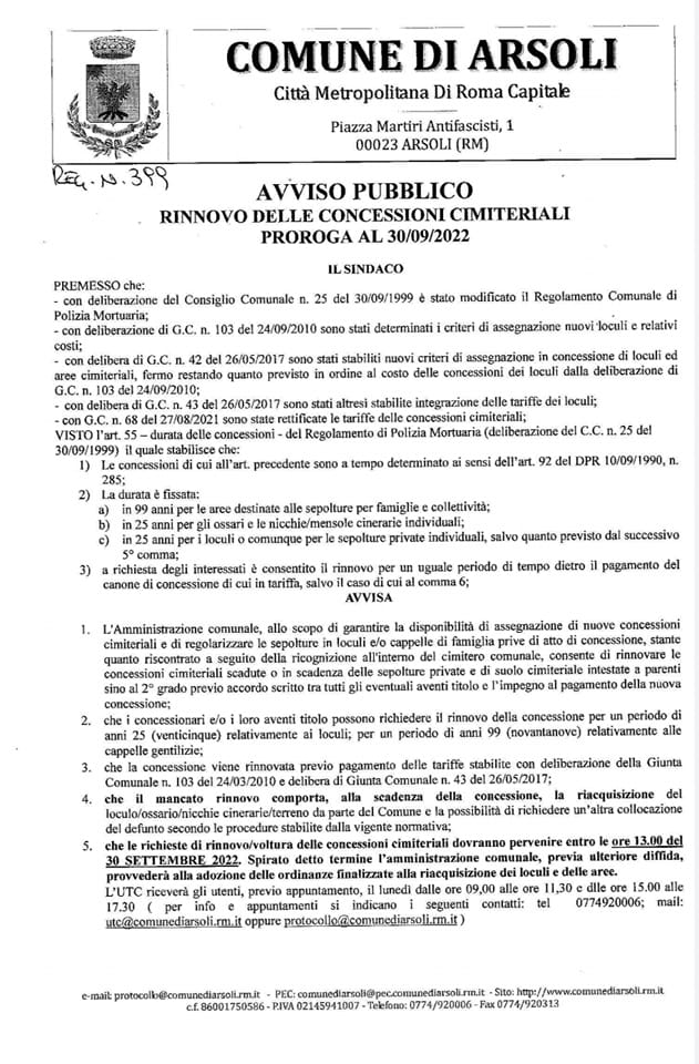 ARSOLI – L’amministrazione comunale ha disposto la proroga al 30 settembre 2022 il termine per presentare domande di rinnovo delle concessioni cimiteriali.