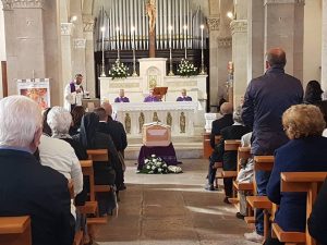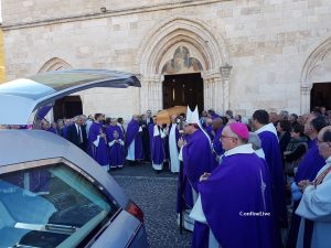 Magliano dei Marsi – In un clima di grande raccoglimento e partecipazione si sono svolti nel pomeriggio odierno i funerali di S.E. Mons. Antonio Santucci, vescovo di Trivento, emerito parroco di Carsoli e grande uomo di Santa Romana Chiesa. La Chiesa Parrocchiale di Santa Lucia era gremita di fedeli, arrivati da ogni dove per rendere il giusto tributo ad un uomo vissuto in odore di santità. Una lunga vita spesa per l’apostolato e vissuta tra i suoi fedeli. Il rito funebre è stato celebrato da S.E. Mons. Claudio Palumbo vescovo di Trivento, con la presenza del Vescovo di Lanciano S.E. Mons. Emidio Cipollo0ne e di molti sacerdoti delle Diocesi di Avezzano e di Trivento ove mons. Santucci ha svolto il suo apostolato vescovile dopo essere stato per dodici anni parroco a Carsoli. La sua figura è stata ricordata da Mons. Palumbo che lo ha definito “sentinella orante della Chiesa”. Presenti i gonfaloni dei Comuni di Magliano dei Marsi luogo che diede i natali al prelato, del Comune di Carsoli e di Trivento, accompagnati dai rispettivi sindaci Mariangela Amiconi, Velia Nazzarro e Domenico Santorelli. Per la comunità di Carsoli molti fedeli erano presenti al funerale, unitamente alla Confraternita del Sacro Cuore, il parroco di Carsoli don Roberto Cristofaro.