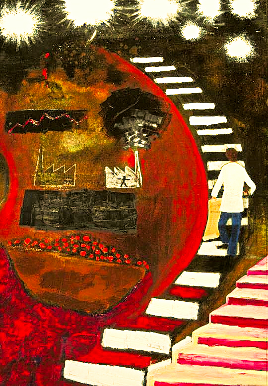 CatturaRedazione-In questo “struggente” quadro del nostro Artista Conterraneo Franco Pompei, esponente dell’”Arte Povera”, viene rappresentato l’Uomo Occidentale Deideologizzato, privo di punti di riferimento interiori, senza più valori guida, figlio di una Società, da lui stesso costruita ,della quale è diventato Succube e Schiavo; un Mondo Contemporaneo governato dall’Imperialismo Economico che ha come meta immediata il produrre sempre di più. E’ l’”Uomo Tecnocratico” che ha perso la sua Umanità, spronato ad avere sempre più potere; non roba e soldi soltanto, ma potere .Non si tratta di Autorità ne tantomeno di Autorevolezza. Questo “ingranaggio Infernale” afferra l’uomo che aderisce alle Leggi dell’Ipermercato Planetario in un morsa che a sua insaputa, lo stritola nella Psiche, nell’Anima e nel Cuore. Quello che gli fa brillare davanti agli “Occhi” è il fatto di possedere più Potere; un Potere per raggiungere sempre più Profitto. E’ il così detto “Feticismo delle Merci” che porta l’Uomo a credere che il Possesso di determinati Prodotti cambi le sue Qualità e che l’Abbondanza di quest’ultimi, possa essere identificata con il suo Arricchimento quale essere umano. L’Uomo si orienta così nella direzione della sua Esteriorità impoverendosi. Niente più Etica o Morale o Religione: la Sincerità, la Lealtà, l’Onestà, la Fedeltà alla Parola data, il Rispetto della Propria e dell’Altrui Persona, la Capacità di Ammirazioni, di Benevolenza e di Altruismo appartengono ad un Mondo Vecchio e Superato. E’ la “Tecnica”, di Galimbertiana Memoria, che domina il tutto; una Tecno-Economia che insieme alla Finanza, produce Diseguaglianze, Guerre, Povertà ecc. e che rischiano di portare l’Intera Umanità verso l’Autodistruzione. E tutto ciò viene evidenziato dall’Autore Pompei nella parte sinistra dell’Opera dove in un “Utero”, vengono rappresentate delle Fabbriche “Inquinanti”, con un “Grafico Economico” insieme ad un “Barcone di Migranti” che naviga in un mare, “Rosso”, del sangue delle Vittime Innocenti. Al centro, una “Scalinata Bianca” sulla quale, “L’Uomo Tecnico” di Franco sale con in mano una “Pergamena”(Giuramento di Ippocrate) verso dove,ci si chiede? Verso una Speranza di Redenzione o di Liberazione rappresentata dalle “ Stelle Bianche” brillanti in un Cielo Scuro. E’ un “Uomo Pentito” per ciò che ha creato; un “Uomo Viandante” che cerca di riscoprire la sua Umanità Perduta; un Uomo che cerca Un Nuovo ordine Etico-Morale Interiore; Un Uomo che ha ripreso a Sperare in un Mondo Migliore insomma, Un “Uomo Ottimista” che vuole riscoprire il senso della sua Esistenza.(Il Colore Bianco della Figura del dipinto simboleggia questo Ottimismo)Un Uomo che tuttavia, può continuare a percorre la strada della “Perdizione” o della sua “Autodistruzione” e le “Scale”, alla sua “Destra”, ne sono una testimonianza. E’ posto di fronte ad un Bivio! Deve Scegliere? Ma chi può Salvare questo Uomo Moderno? La Salvezza, ed è questo il messaggio(Stelle Bianche), è rappresentata dalla Riscoperta di Una Nuova Umanità; un Nuovo Umanesimo che riporti al Centro L’Uomo-Individuo; il Nuovo Umanesimo di Papa Francesco, di Don Andrea Gallo, di Fabrizio De Andre(Una Smisurata Preghiera);Un Umanesimo che rinasce nel riconsiderare gli “Ultimi”, gli “Emarginati” dalla Società, I “Peccatori”:difenderli e rivalutarli perché dalla loro Umiltà, Semplicità e Sofferenza è possibile ritrovare quella Felicità, Amore e Gioia di vivere che Salva L’Uomo da una “Eterna Dannazione”.(m.m.)