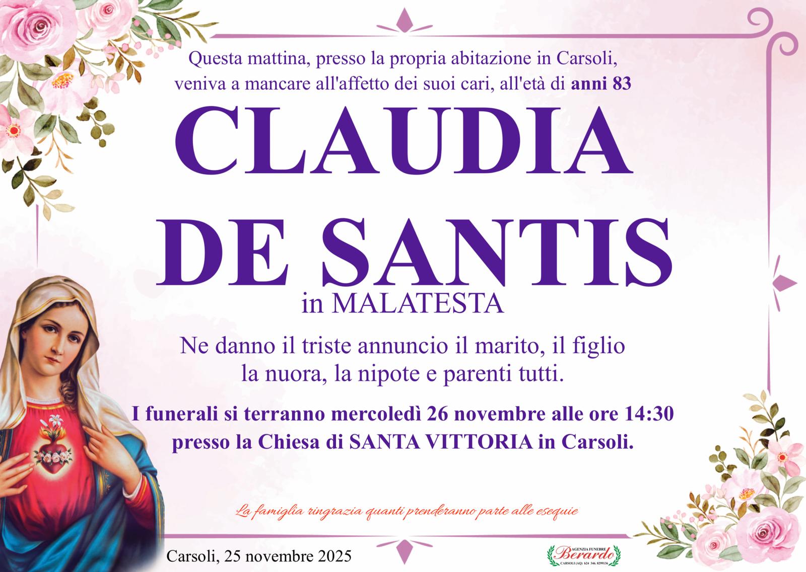 Lutto a Carsoli per la scomparsa della cara Claudia De Santis in Malatesta