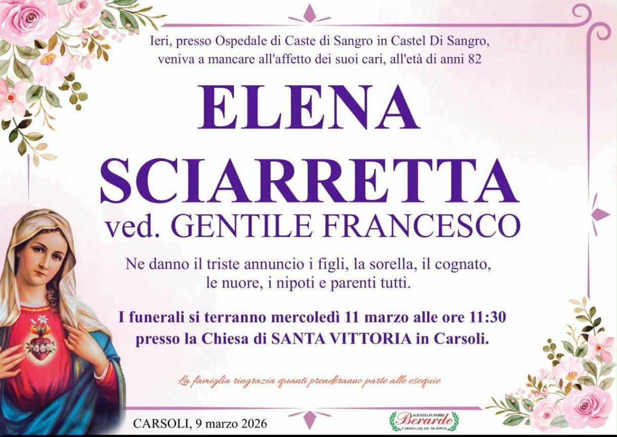 L’ultimo saluto a Carsoli mercoledì 11 marzo 2026 alle ore 11.30 presso la Chiesa Parrocchiale di Santa Vittoria.