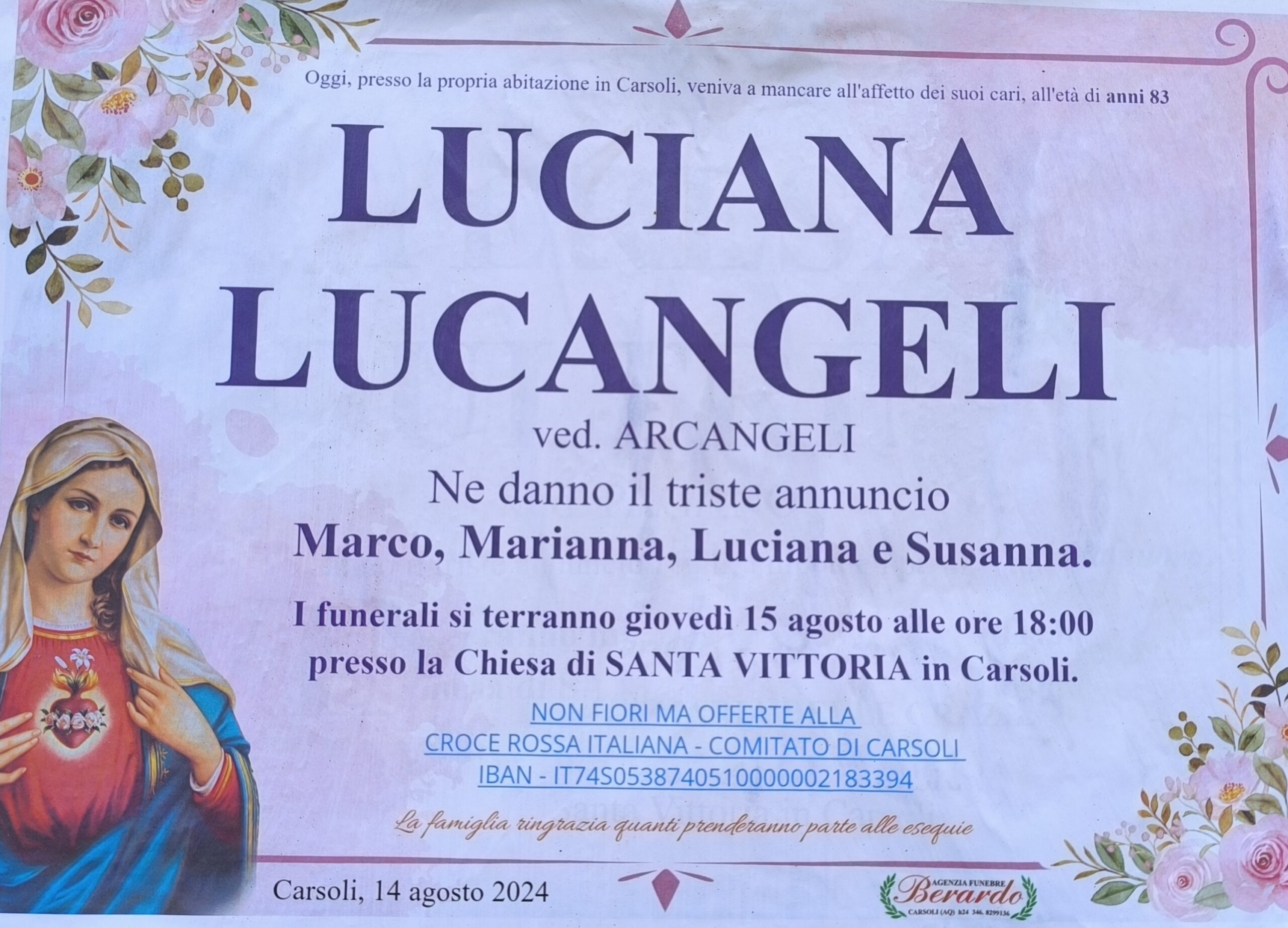 L’Agenzia Funebre Berardo rende nota la necrologia per la scomparsa della cara Luciana Lucangeli ved. Arcangeli.