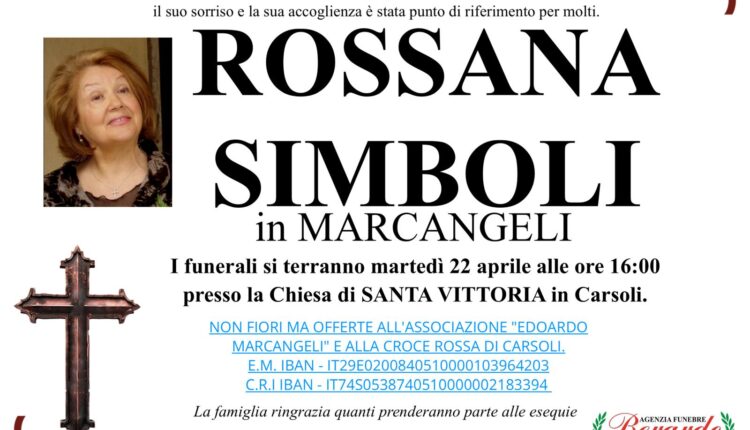 Si rende noto che sono stati disposti i funerali per l’ultimo addio alla cara Rossana Simboli. L’ultimo saluto avrà luogo presso la Chiesa di Santa Vittoria in Carsoli il giorno martedì 22 aprile 2025 alle ore 16.00. Rip.