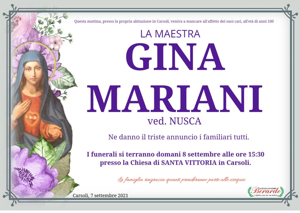 La Maestra Gina va ricordata per il suo particolare garbo e sobrietà. Ha insegnato a molte generazioni presso la scuola Elementare “Carlo Scarcella” di Carsoli. Con lei scompare una figura di riferimento nella vita scolastica e della comunità di Carsoli. Devota alla fede cristiana, ora si ricongiunge con l’amato marito Domenico. Riposi in pace