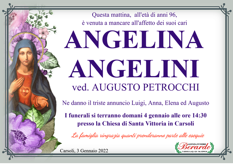 Angelina Angelini, è stata indubbiamente una grande donna, saggia, schietta e determinata, discendente di una delle famiglie che maggiormente hanno dato lustro al territorio incidendo fortemente per la ripresa nei difficili periodi del dopoguerra ed apportando sempre aiuto al prossimo.
