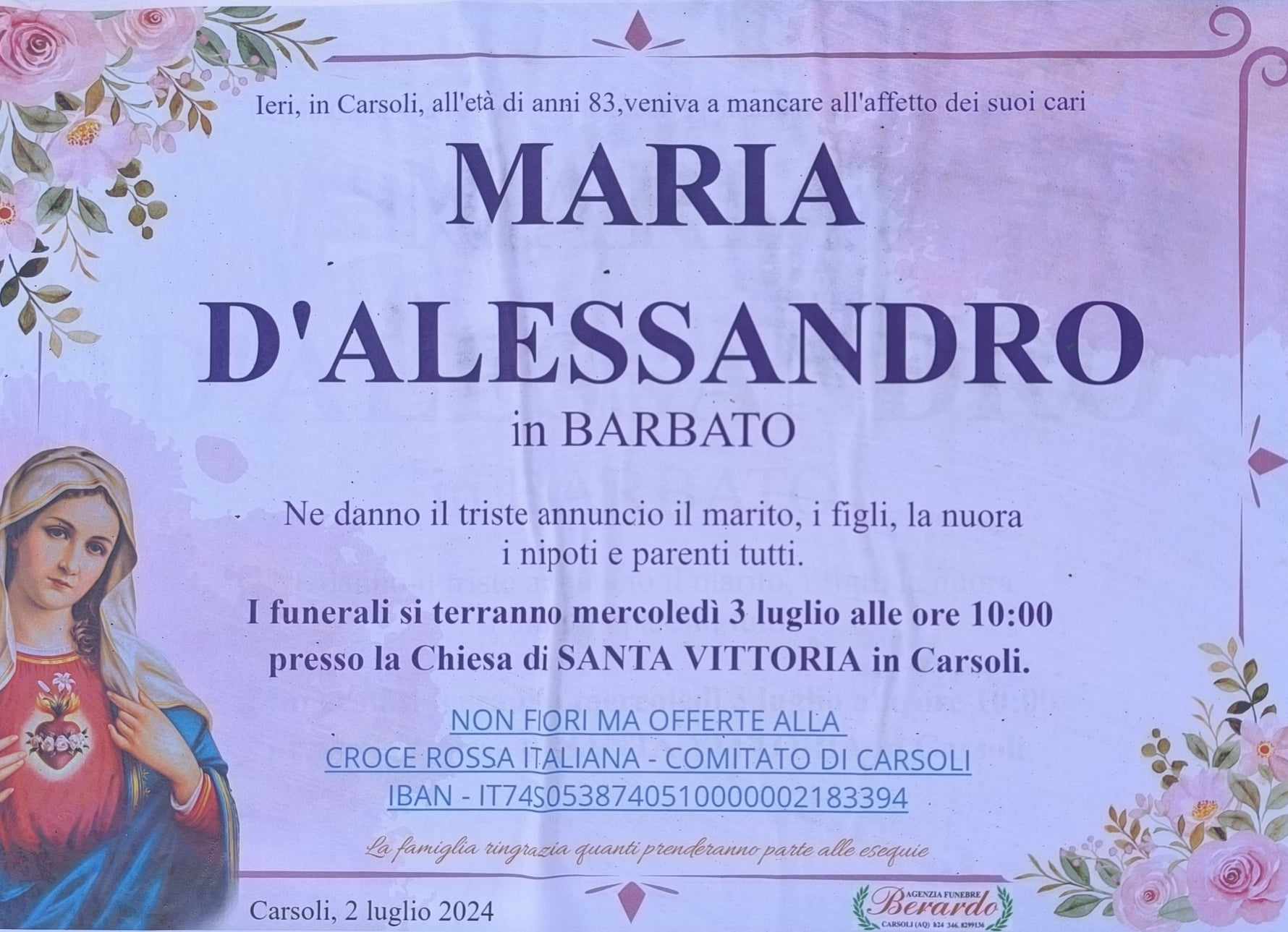 L’Agenzia Funebre Berardo annuncia la tristia per la scomparsa di Maria D’Alessandro in Barbato.