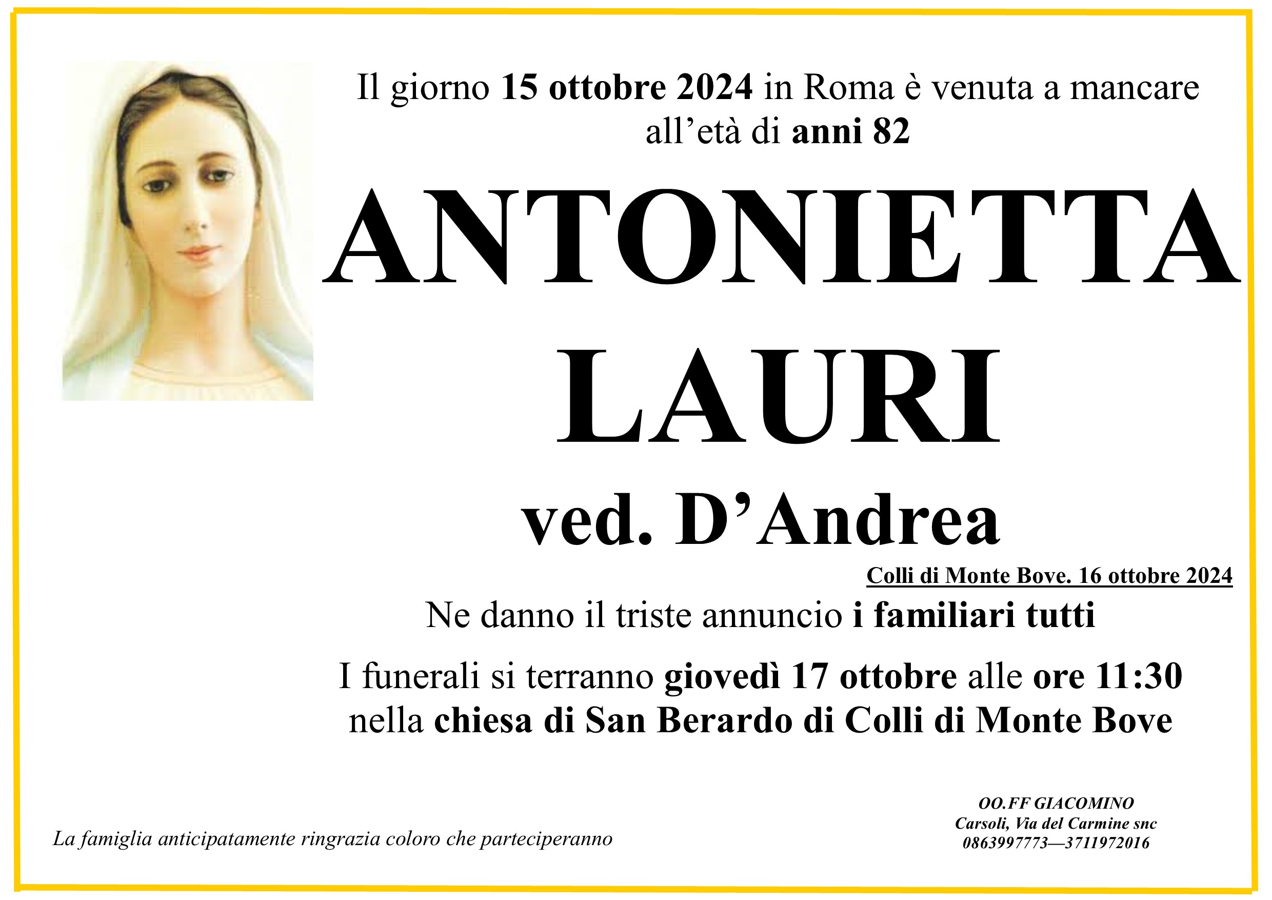 Colli di Monte Bove – Ieri in Roma presso il Campus Biomedico è mancata all’affetto dei suoi cari ANTONIETTA LAURI ved. D’Andrea – di anni 82. La camera ardente è allestita presso la Fondazione Policlinico Universitario Campus Biomedico di Roma dalle ore 11 alle ore 15.oo del 16 ottobre e dalle ore 8 alle ore 10.00 del 17 ottobre 2024. I funerali avranno luogo in Colli di Monte Bove, presso la Chiesa di San Berardo il giorno 17 ottobre 2024 alle ore 11.30.