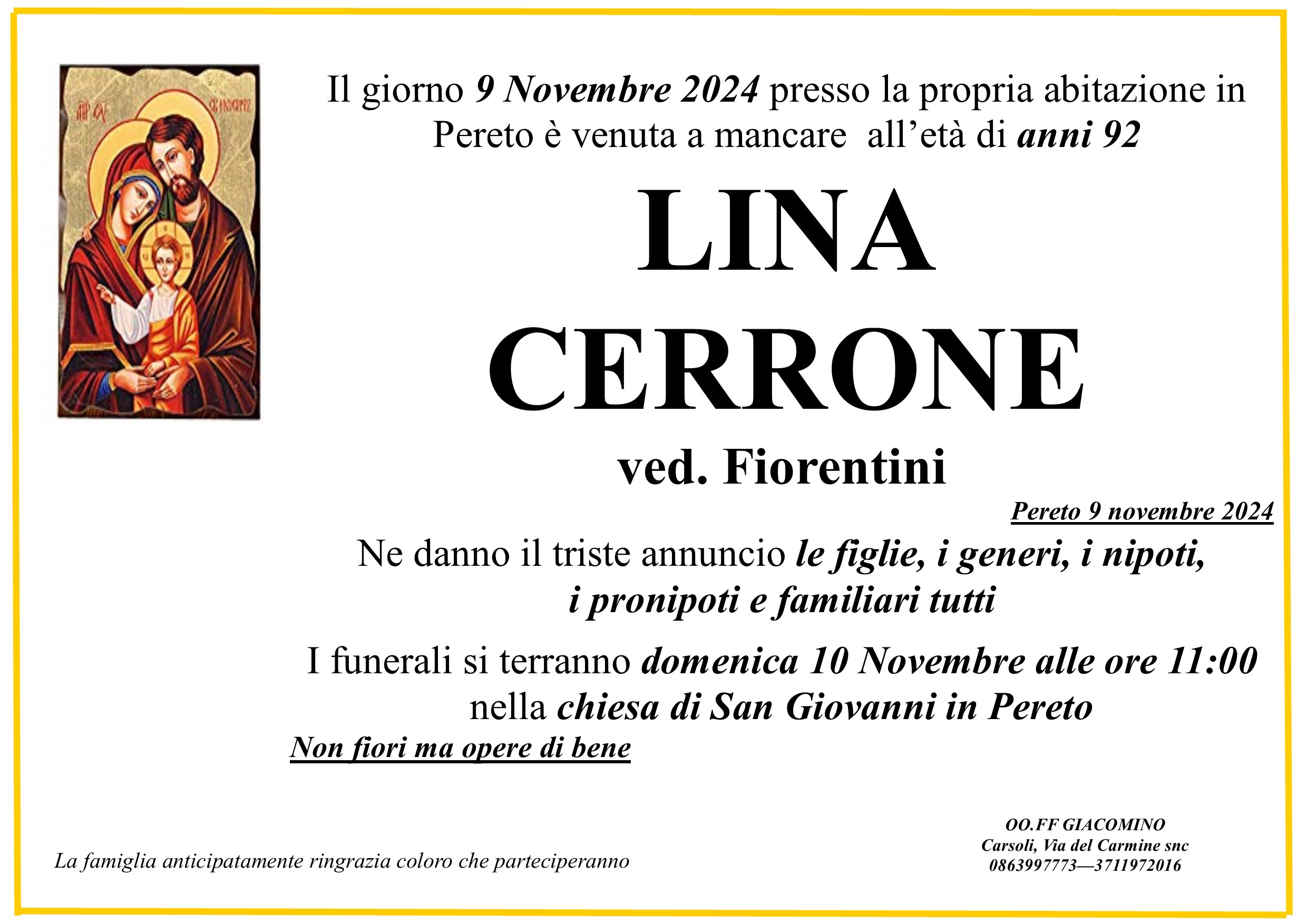 Oggi 9 novembre in Pereto Lina Cerrone ved. Fiorentini è mancata all’affetto dei suoi cari. Di seguito il necrologio: