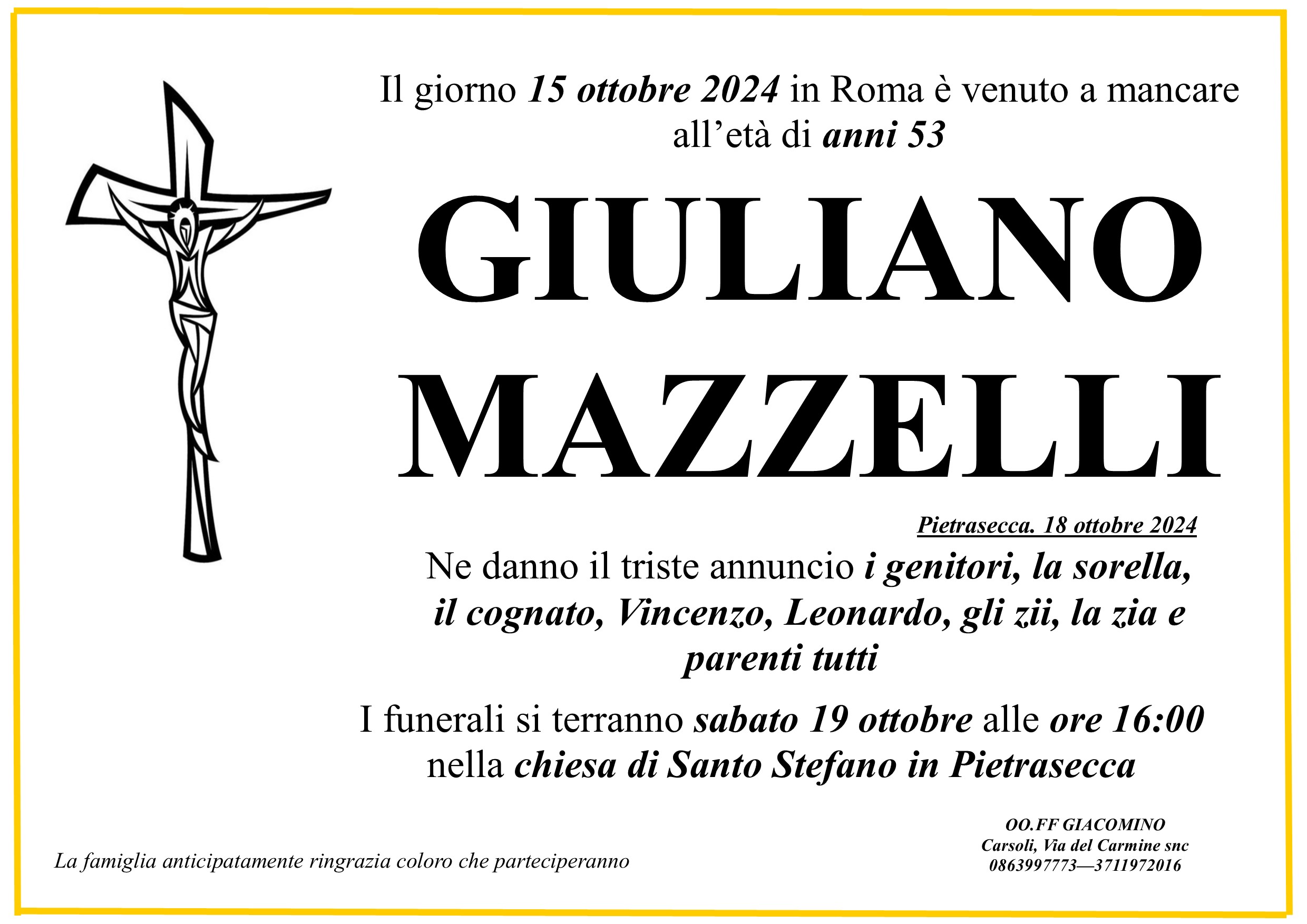 PIETRASECCA DI CARSOLI – Il giorno 15 ottobre è venuto a mancare all’affetto dei suoi cari all’età di anni 53 il caro GIULIANO MAZZELLI. Lo annunciano: i genitori, la sorella, il cognato, Vincenzo, Leonardo, gli zii, la zia, e parenti tutti.