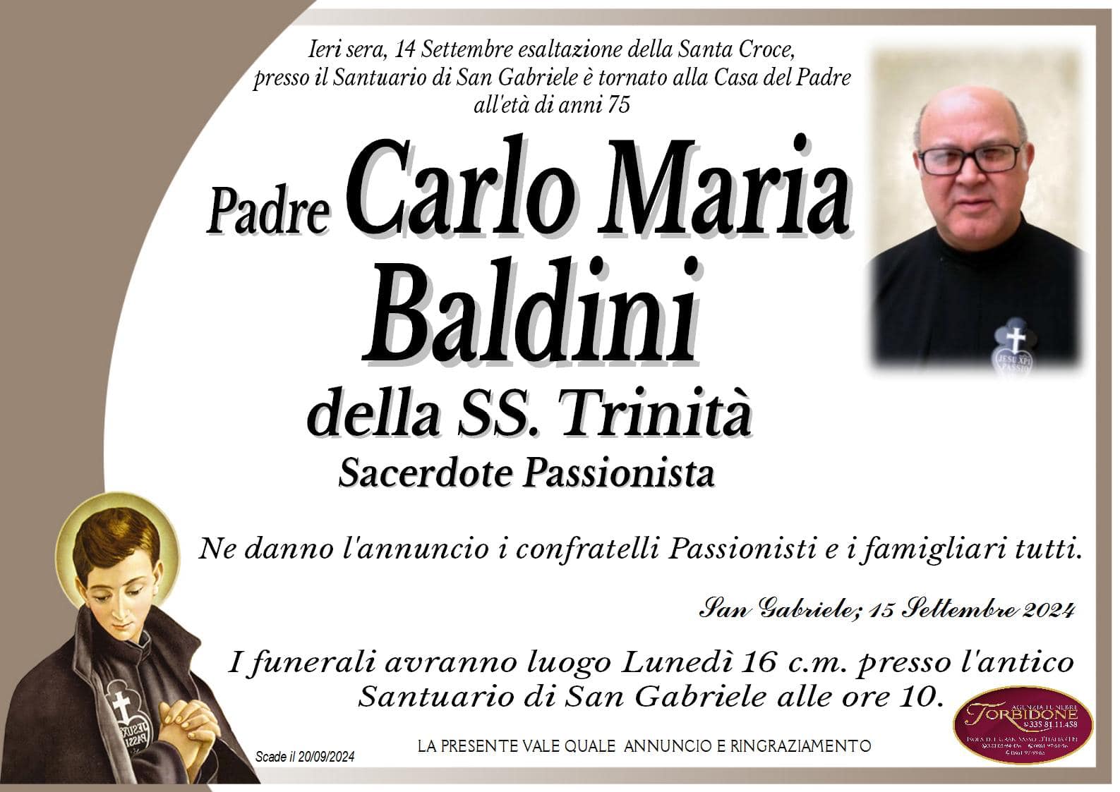 Isola del Gran Sasso d’Italia – Ieri Il 14 settembre, Esaltazione della S. Croce, alle ore 20:05, padre Carlo Maria Baldini è mancato presso l’infermeria di san Gabriele, ed è tornato così alla casa del Padre. P. Carlo Maria è nato a Cavatassi di Tortoreto (TE) il 17 febbraio1949 (75 anni), da Giovanni e Anna Gasparroni. Nel 1965, entra nel noviziato Morrovalle e, dopo un anno, emette i primi voti il 15 settembre 1966. Si consacra in perpetuo il 1° settembre 1972. Viene ordinato sacerdote il 31 agosto 1974 a Tortoreto (TE). Da molti anni risiedeva nella comunità di San Gabriele dell’Addolorata.