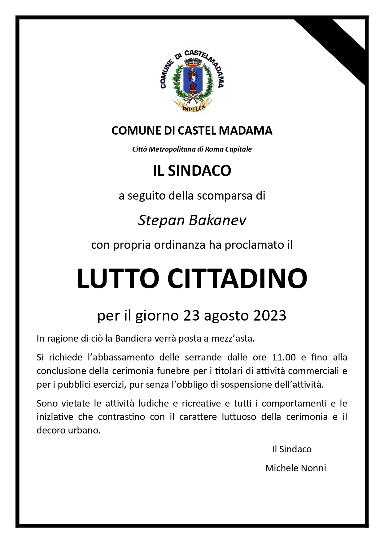 CASTEL MADAMA – E’ il giorno dell’addio per il piccolo Stepan, il bambino di 8 anni che è morto tragicamente in un incidente occorsogli presso le terme Sabine di Crotone. Risucchiato dal canale di scarico delle vasche piscine disposte in svuotamento. E dopo l’autopsia e l’avvio serrato di indagini (la struttura è sotto sequestro giudiziario), la salma del piccolo bimbo sarà rilasciata questa mattina e dall’Istituto di Medicina legale, raggiungerà Castel Madama ove alle ore 11. si svolgeranno i funerali. Il sindaco Nonni ha proclamato il lutto cittadino, stessa iniziativa è stata intrapresa dal comune di Palombara Sabina ove ha avuto luogo la tragedia. Tutta la comunità castellana si stringerà intorno ai familiari per questa immane tragedia. Non doveva certo andare così: una giornata di svago che si trasforma in giornata di morte.