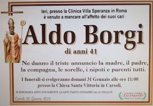Ieri presso la Clinica Villa Speranza in Roma è venuta a mancare all’affetto dei suoi cari all’età di anni 41 la cara esitenza di ALDO BORGI