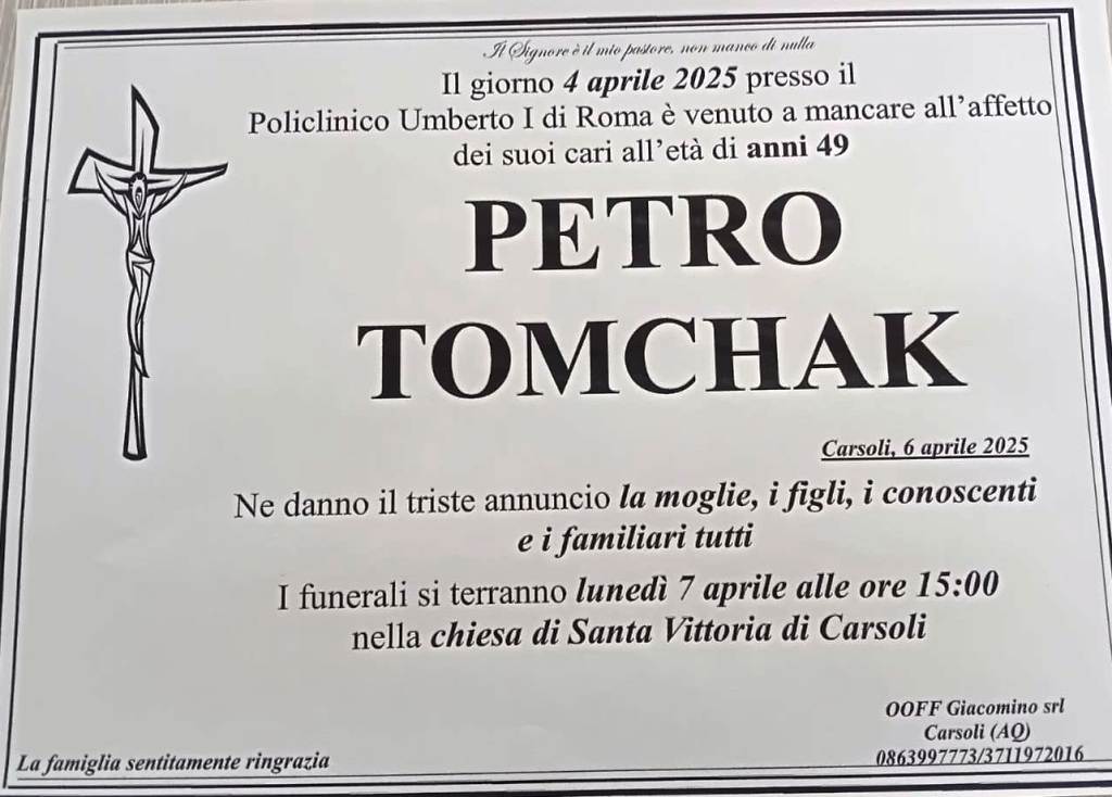 Carsoli – Giorno 4 Aprile 2025 in Roma presso il Policlinico Umberto I° è mancato prematuramente all’affetto dei suoi cari PETRO TOMCHAK, di anni 49.