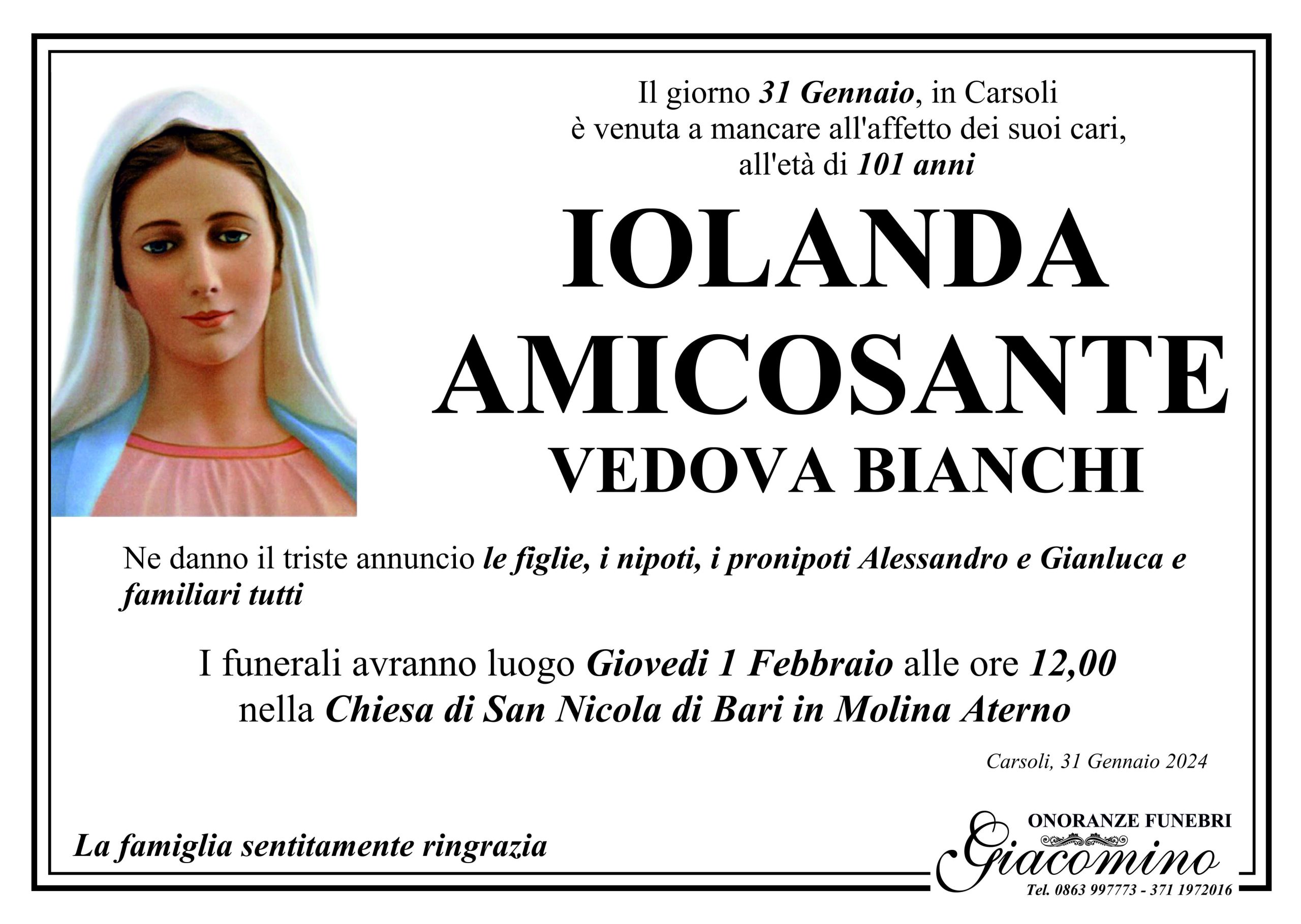 Lutto per la scomparsa della cara Iolanda Amicosante ved. Bianchi