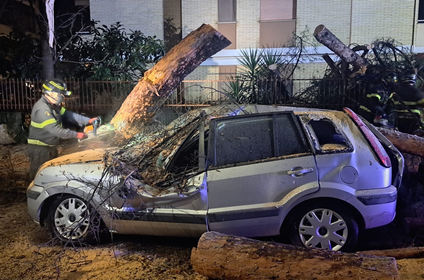 Maltempo a Guidonia, grosso pino cade e distrugge auto