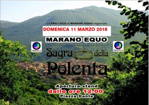 Marano Equo – La prevista Sagra della Polenta organizzata per domenica 25 febbraio è stata posticipata a DOMENICA 11 MARZO 2018. Resta inalterato il programma e tutto il fascino e convivialità di questa giornata che sarà tutta da vivere. La Pro-Loco in relazione alle previsioni meteo che preannunciano severo maltempo, ha pertanto opportunamente disposto e comunicato il rinvio.