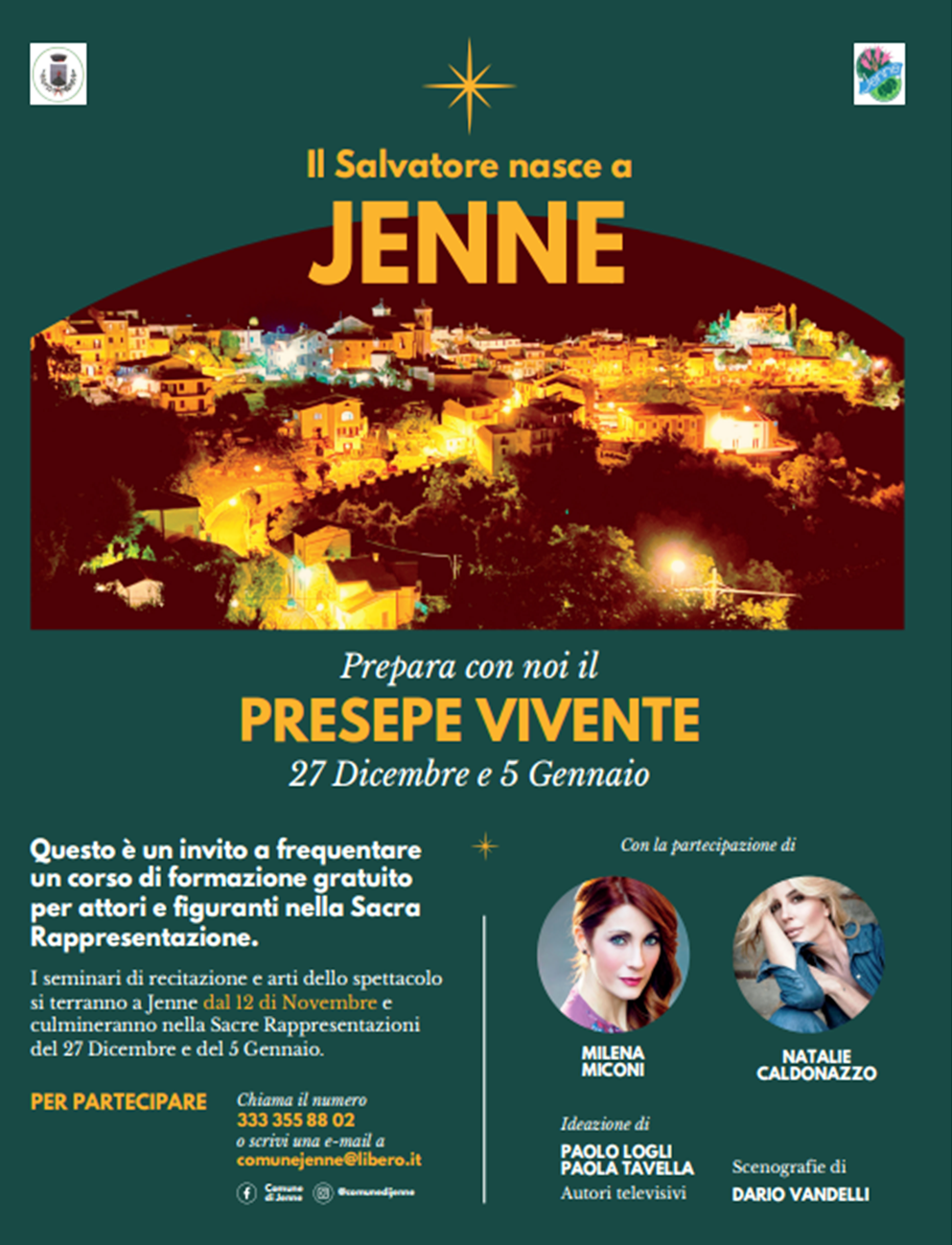 JENNE – Si è svolto ieri pomeriggio il primo seminario illustrativo delle varie attività correlate al progetto “Il salvatore nasce a Jenne“. Molta la partecipazione popolare di gruppi, cittadini, associazioni che diventano parte attiva di questa edizione speciale 2022. Jenne da sempre si caratterizza per il particolare fascino e le beltà presepiali, e quest’anno oltre al percorso per le vie suggestive di Jenne che potrà essere apprezzato per tutto il periodo, è previsto il coinvolgimento diretto con un nuovo format partecipativo e di qualificazione professionale coordinato da due autori televisivi di chiara fama: Paolo Logli e Paola Tavella.