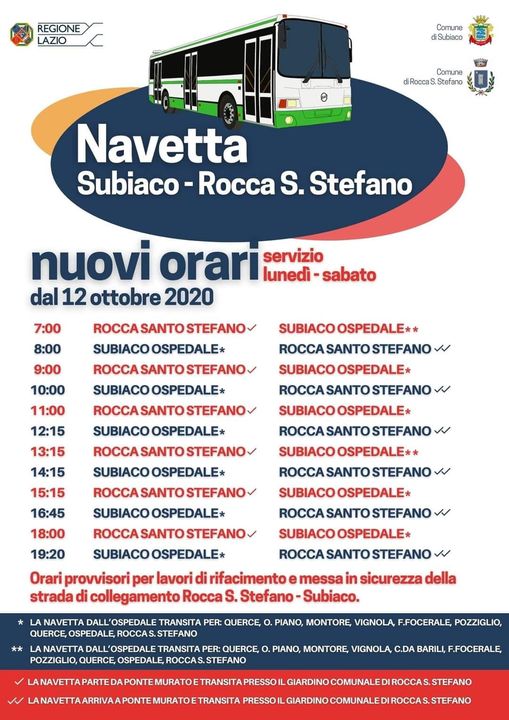 Come preannunciato nei giorni scorsi dai sindaci Francesco Pelliccia e Sandro Runieri, il 12 ottobre avranno inizio i lavori di messa in sicurezza e riqualificazione della strada Rocca Santo Stefano-Subiaco, che renderanno necessarie alcune temporanee modifiche al trasporto pubblico locale.