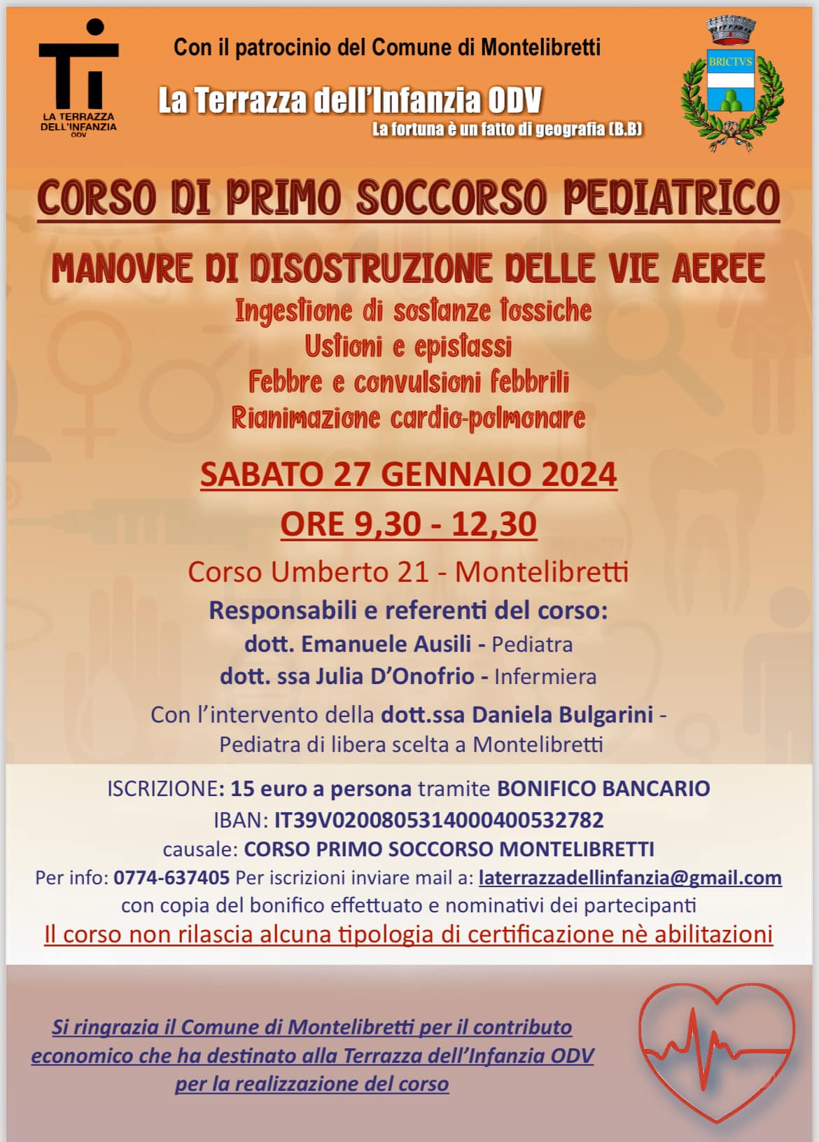 Il Comune di Montelibretti, in collaborazione con “La Terrazza dell’infanzia ODV” e con l’intervento della pediatra di libera scelta a Montelibretti, dott.ssa Bulgarini, presenta Il CORSO DI PRIMO SOCCORSO PEDIATRICO, che non solo darà la possibilità di IMPARARE A PRATICARE le manovre di disostruzione, ma tratterà anche di febbre e convulsioni febbrili, ingestione di sostanze tossiche, ustioni, epistassi e rianimazione cardio polmonare.