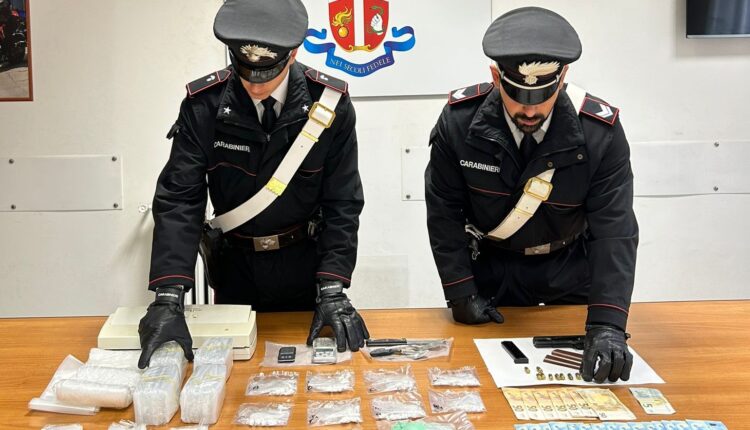 Gli ulteriori accertamenti presso l’abitazione dell’uomo hanno consentito di rinvenire un cospicuo quantitativo di materiale per il confezionamento, nonché una pistola a salve, 2 proiettili e 8 bossoli cal. 380.