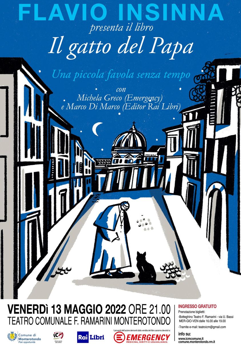 Monterotondo – Venerdì 13 maggio alle ore 21, al Teatro Comunale Ramarini di Monterotondo, Flavio Insinna presenta  il suo libro “Il gatto del Papa. Una piccola favola senza tempo”.