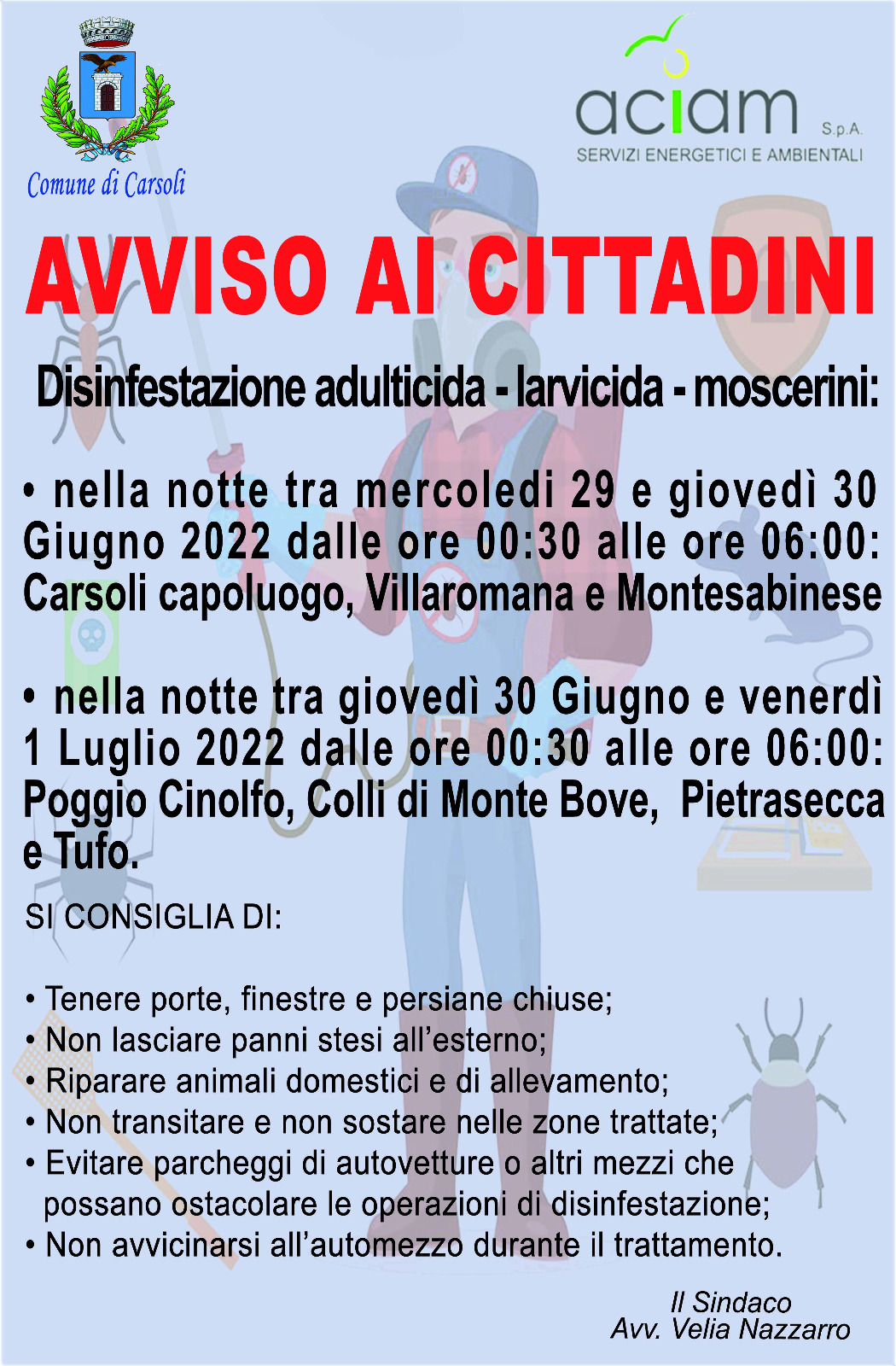 CARSOLI – E’ stata disposta la disinfestazione generale nel territorio comunale di Carsoli, queste le specifiche: