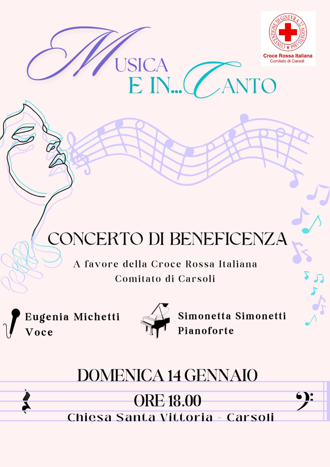 CARSOLI – L’appuntamento è per Domenica 14 gennaio 2024 alle ore 18.00 presso la Chiesa Parrocchiale di Santa Vittoria con “Musica e in Canto”, un evento che coniuga la beltà della musica in voce con Eugenia Michetti, ed al piano con la professoressa Simonetta Simonetti. Le offerte raccolte saranno devolute alla Croce Rossa Italiana – comitato di Carsoli.