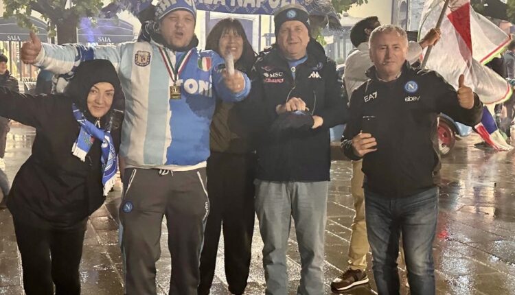 Castel di Sangro. Festa a Castel di Sangro per il Napoli campione d’Italia. Da tre anni la squadra di Conte si allena nello stadio Patini della città abruzzese per il ritiro estivo e venerdì sera neanche la pioggia ha fermato i tifosi esultanti.