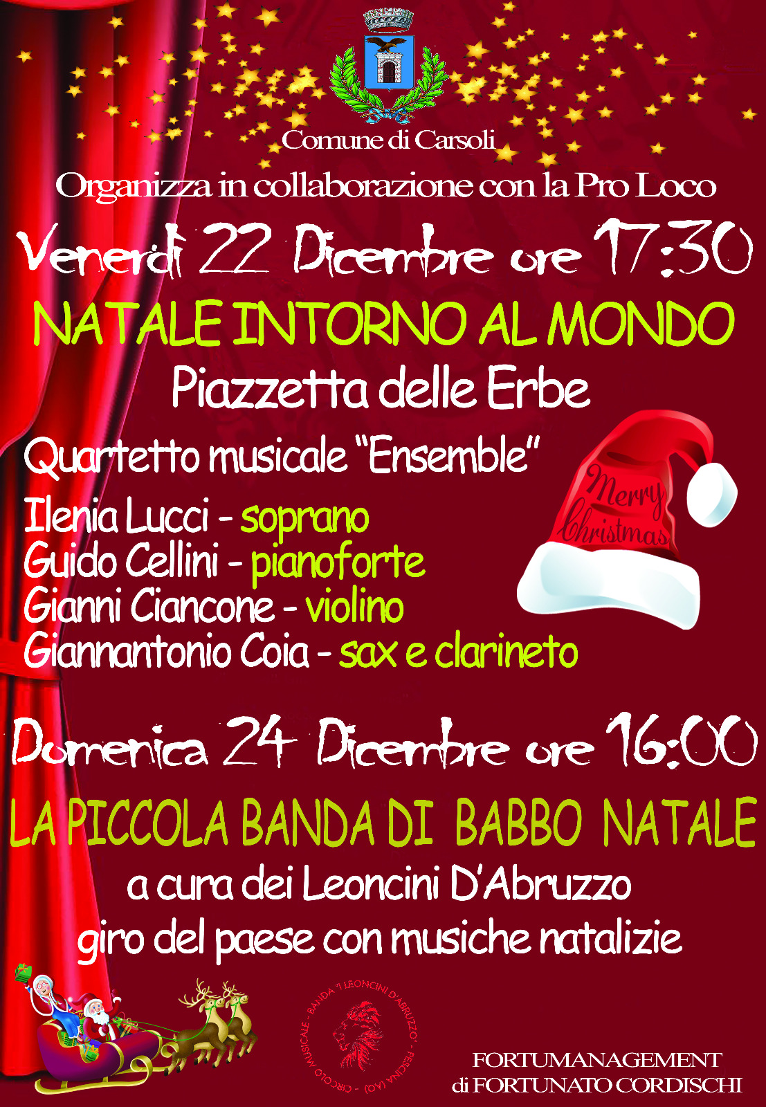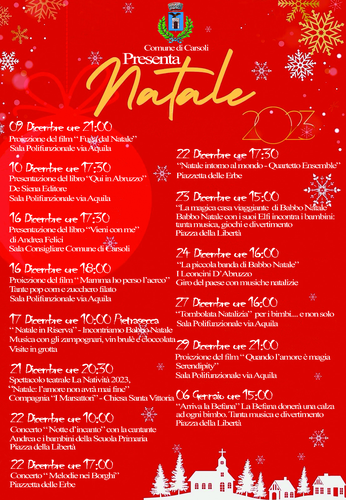 CARSOLI – L’amministrazione comunale ha aggiornato il calendario degli eventi in corso per tutto il periodo natalizio: spazio per tante iniziative tutte da vivere: di seguito la locandina aggiornata: