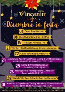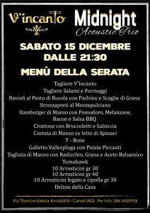 Pubbliredazionale – Ed ecco il Dicembre in festa con il Natale di V’Incanto, un mese ricco di eventi, iniziative per festeggiare stare in amicizia all’insegna del buon gusto e della buona musica. Gli eventi del 1 e dell’8 dicembre scorso hanno fatto riscontrare un successo in crescendo e proseguono con Sabato 15 Dicembre con il Midnight Acoustic Trio.