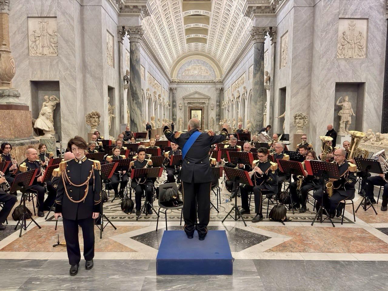 CITTA’ DEL VATICANO – Un connubio perfetto tra musica, arte e spiritualità ha risuonato ieri sera tra le meravigliose sale dei Musei Vaticani, uno degli scenari più suggestivi e simbolici al mondo. Protagoniste della serata, la Banda Musicale e la Banda del Corpo della Gendarmeria Vaticana, unite in un’unica, emozionante esibizione che ha incantato il pubblico presente.