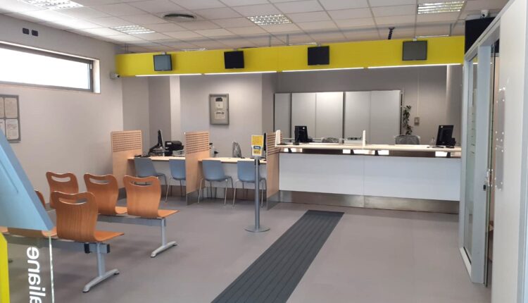 Nell’ambito degli interventi, si inseriscono la nuova configurazione della sportelleria, con altezze ribassate per agevolare tutti i segmenti di clientela e postazioni di lavoro ergonomiche per favorire posture corrette, e la posa di un percorso in rilievo sul piano di calpestio per consentire alle persone con deficit visivi la piena autonomia negli spostamenti all’interno della sala al pubblico senza l’ausilio di assistenza.