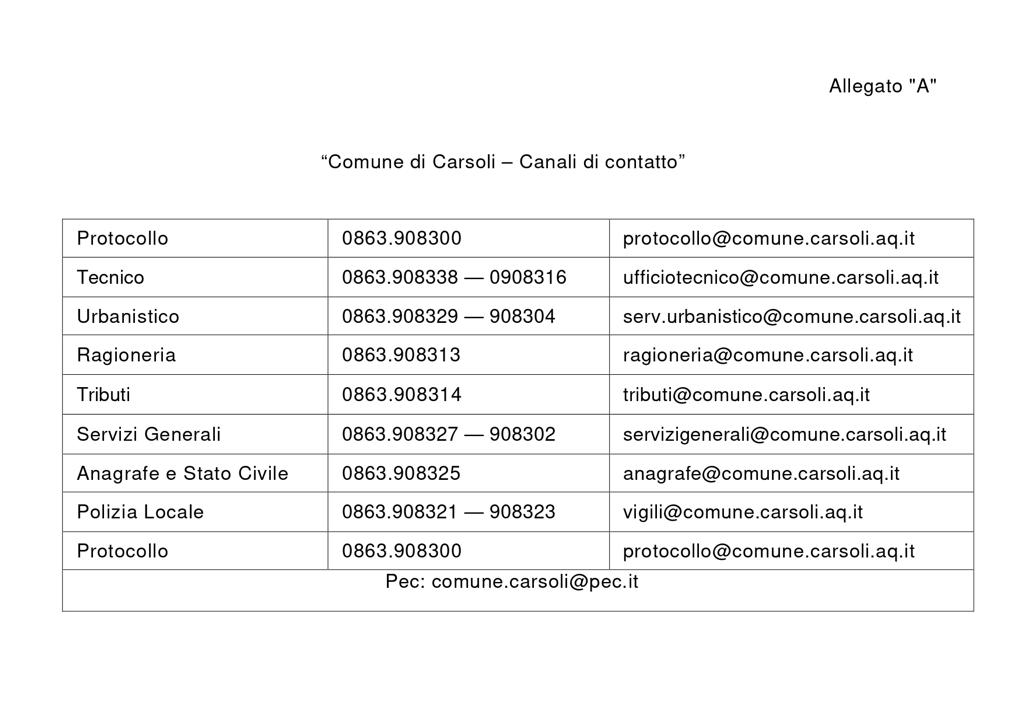 Disposizioni per l’accesso ai servizi del Comune di Carsoli dal 16 al 25 Marzo 2020