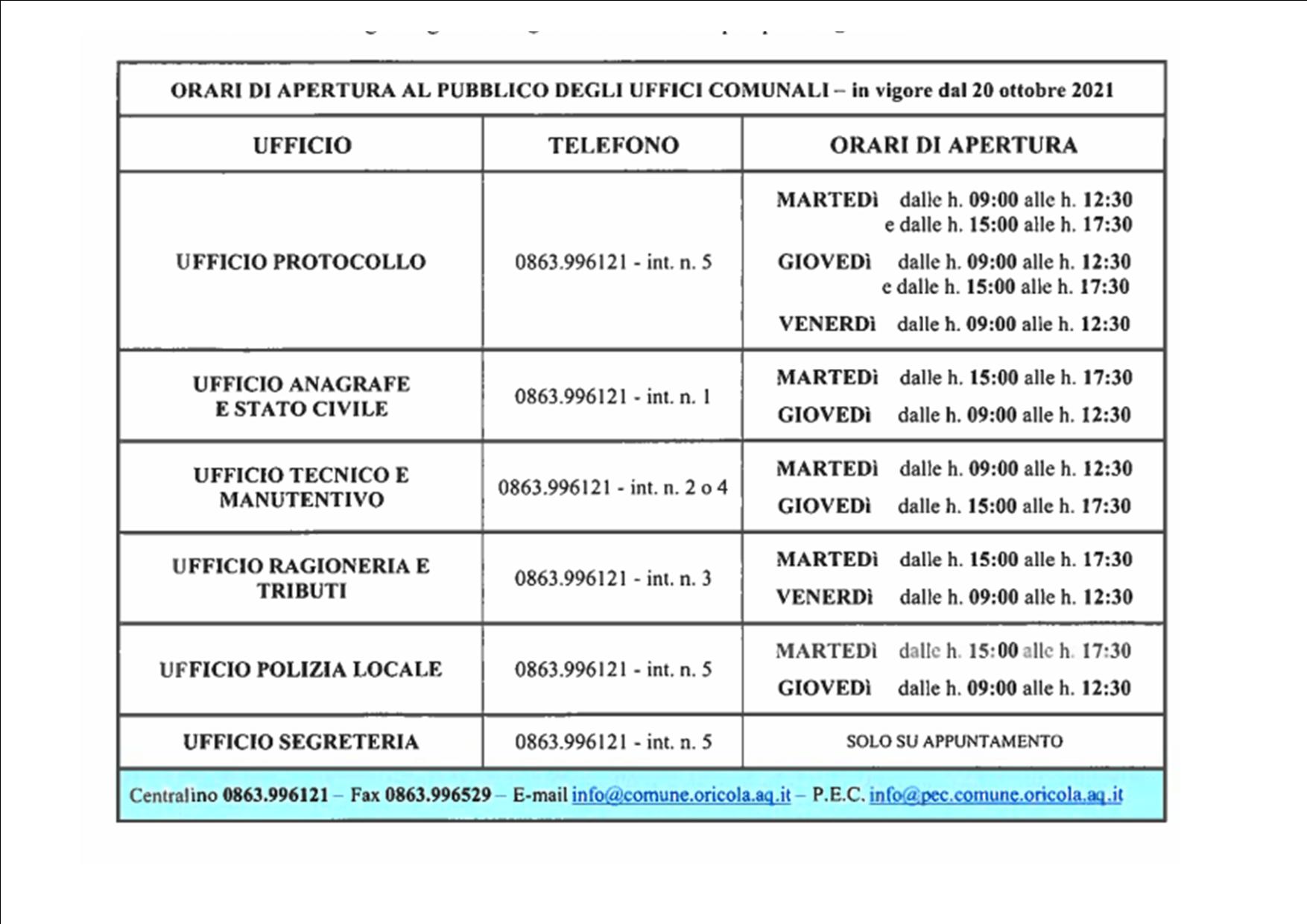 Oricola – Con Ordinanza del sindaco Antonio Paraninfi il comune di Oricola ha modificato gli orari di apertura degli uffici comunali,  di seguito le nuove disposizioni: