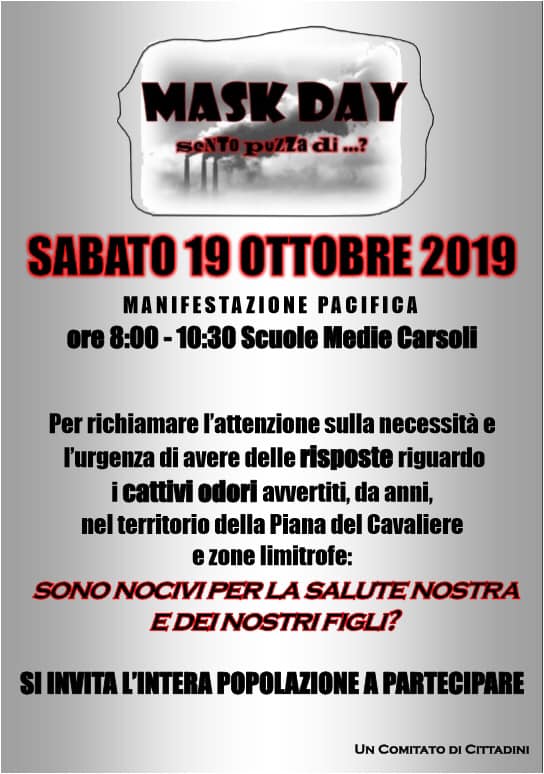 Tale evento – spiega il comitato in una nota – si terrà presso il plesso scolastico delle scuole medie. Genitori, cittadini e ragazzi indosseranno mascherine antismog distribuite gratuitamente dal comitato organizzatore presso un gazebo posto nello spazio antistante la scuola stessa. Lo scopo di questo evento è quello di ribadire il diritto alla nostra salute e la necessità di fare chiarezza sulle cause e sugli eventuali effetti degli odori molesti presenti nel nostro territorio. Tutti i cittadini sono invitati a partecipare numerosi. Tale iniziativa, di natura pacifica e dimostrativa, non ha nessuna connotazione politica”.