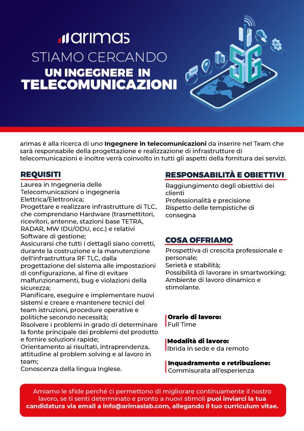Offerte lavoro: Arimas ricerca ingegnere in telecomunicazioni
