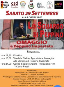 Cineto Romano – Si svolgerà il prossimo sabato 29 settembre a Cineto Romano una interessante giornata di riflessione sul tema “Lo sguardo di Peppino”, un omaggio dedicato a Peppino Impastato. L’appuntamento – spiega il Sindaco Massimiliano Liani – è per le ore 17.30 quando tutto avrà inizio con un dibattito di approfondimento presso la nostra sala consiliare, a seguire procederemo alla apposizione dell’immagine alla memoria, per poi assistere alle ore 21.00 alla proeizione del film “I cento passi”, presso i locali del centro sociale anziani. Invito tutti a partecipare”. L’evento è sostenuto da una serie di associazioni e gruppi, i quali saranno presenti in tutte le fasi.