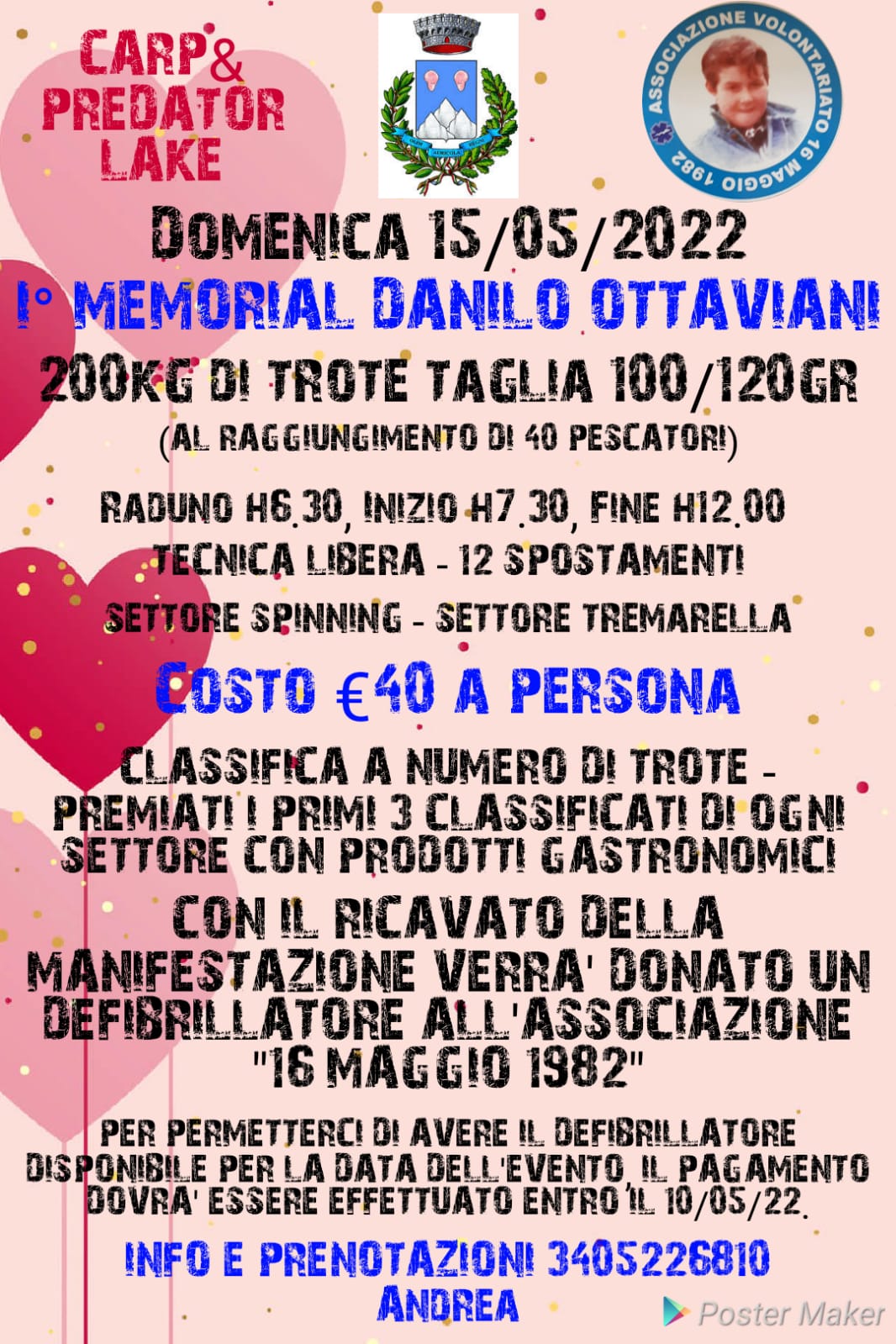 ORICOLA – Al via il primo memorial dedicato a Danilo Ottaviani, a cui è dedicata la data del 16 Maggio 1982, che porta il nome dell’associazione di volontariato a lui dedicata.  Danilo venne strappato giovanissimo alla vita da un tragico incidente. Ed in occasione del quarantesimo anniversario è stata organizzata questa manifestazione organizzata in collaborazione tra l’associazione 16 maggio 1982, Carp& Predator fish e con il patrocinio del comune di Oricola.