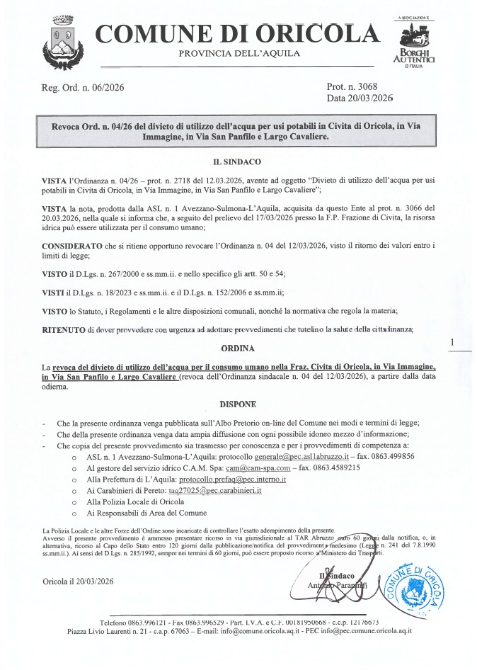 Oricola – Il sindaco Antonio Paraninfi ha disposto la revoca della precedente ordinanza con la quale era stata dichiarata la non potabilità dell’acqua pubblica. A seguito di lavori e di ulteriori controlli ed analisi svolte dalla Asl, ora i parametri di torbidità sono rientrati nella norma, per cui il disposto.