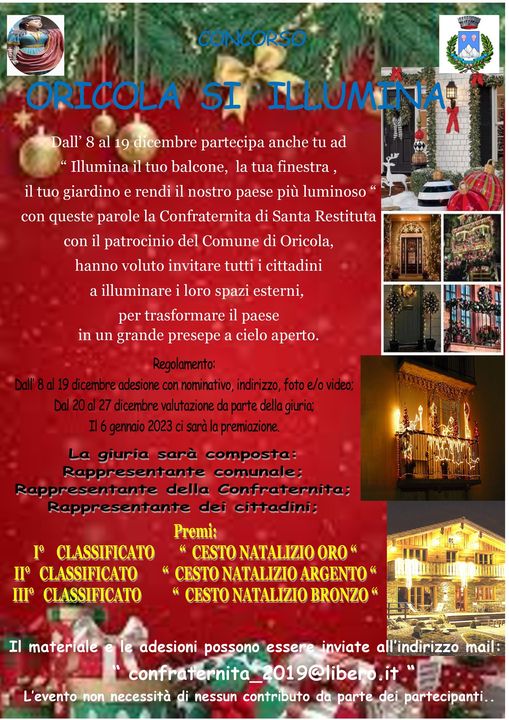 ORICOLA -Al via ad Oricola il concorso “Oricola si illumina”. Per il periodo compreso tra l’8 ed il 19 dicembre l’organizzazione curata dalla Confraternita Santa Restituta in collaborazione con il comune di Oricola, si potrà partecipare a rendere piu’ bello e luminoso il borgo. L’obiettivo è presentare Oricola come un presepe naturale a cielo aperto. La premiazione, avverrà il 6 gennaio secondo le valutazioni espresse dalla qualificata giuria.  E dunque avanti tutta.