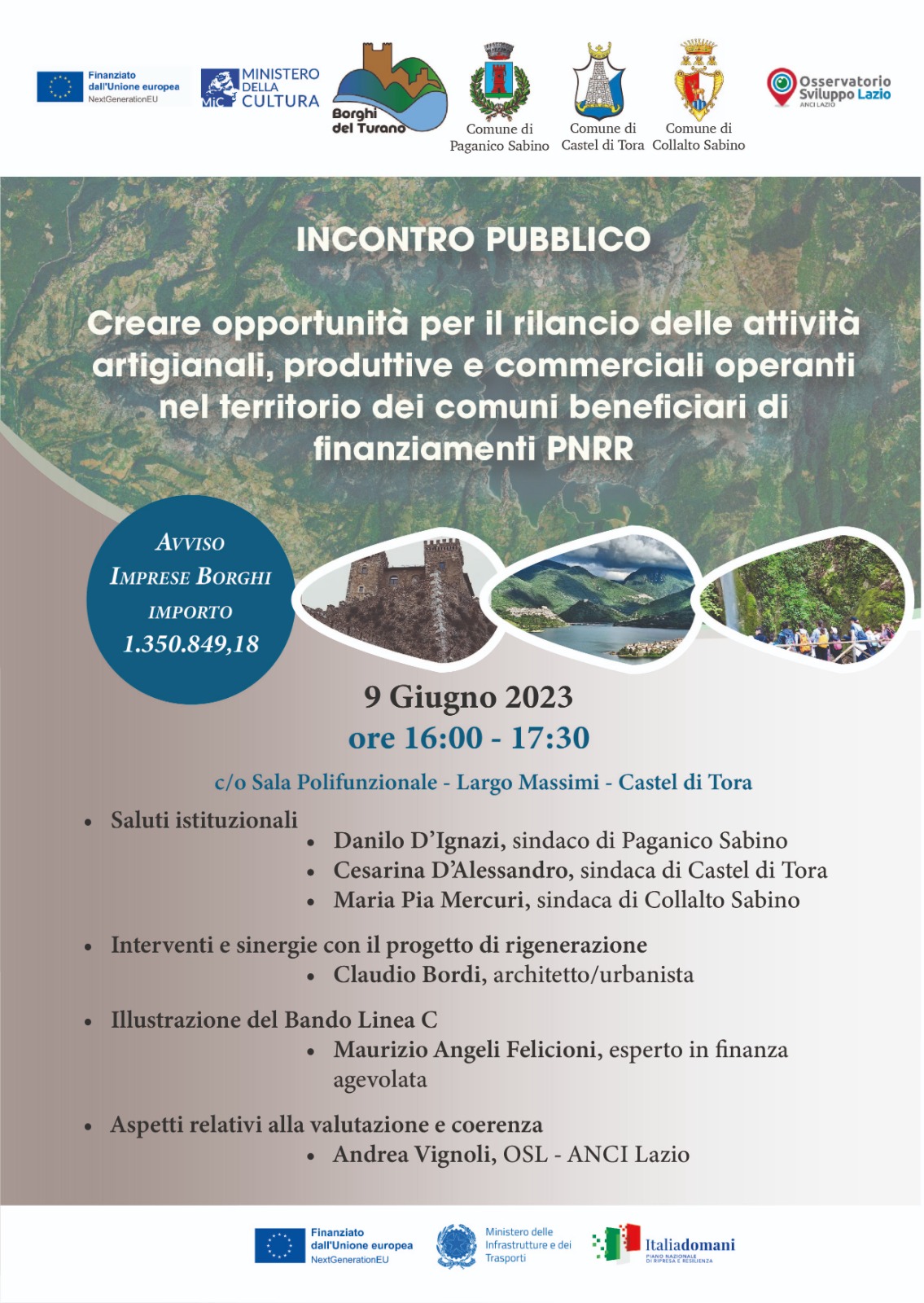 Durante l’incontro si illustrerà l’Avviso pubblico per il sostegno di iniziative imprenditoriali realizzate nei comuni assegnatari di risorse per l’attuazione di Progetti locali di rigenerazione culturale e sociale dei piccoli borghi storici nell’ambito del PNRR, Missione 1 – Digitalizzazione, innovazione, competitività e cultura, Component 3 – Cultura 4.0 (M1C3). Misura 2 “Rigenerazione di piccoli siti culturali, patrimonio culturale, religioso e rurale”, Investimento 2.1: “Attrattività dei borghi storici”, Linea B. Progetti locali di rigenerazione culturale e sociale dei piccoli borghi storici, finanziato dall’Unione europea – NextGenerationEU