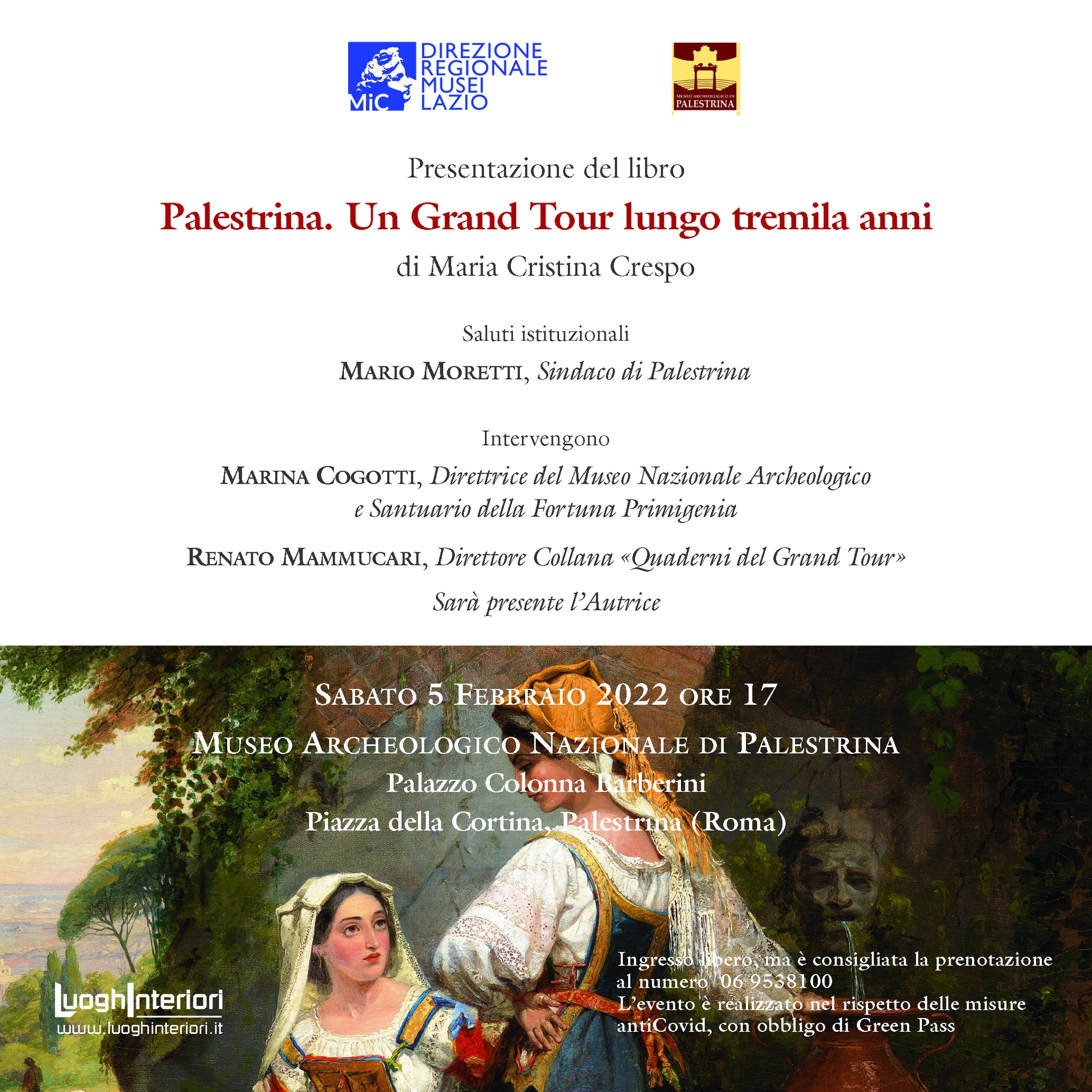 Palestrina – Sabato 5 febbraio alle ore 17, si terrà la presentazione del libro “Palestrina. Un Grand Tour lungo tremila anni”, di Maria Cristina Crespo, alla presenza del Sindaco Mario Moretti, della Direttrice del Museo Marina Cogotti, del direttore della collana “Quaderni del Grand Tour” Renato Mammucari.